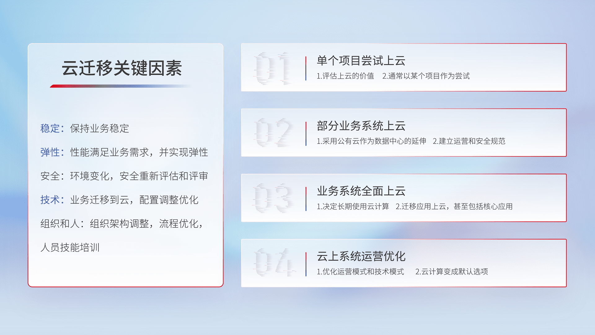 结合实际业务,,,,从规划设计、、、云平台选型、、、云原生改造、、、、数据迁移、、、、集成交付,,,,迁移全过程为客户识别最佳上云路径,,,,做好风险识别管理,,,设计网络架构、、、、身份权限、、、安全审计合规、、、操作审计、、、日志审计、、、、监控告警策略、、、、多站点容灾设计等,,对云上基础设施进行整体规划,,提升IT治理水平,,,,以满足弹性、、高可用、、、高性能的需求。。。