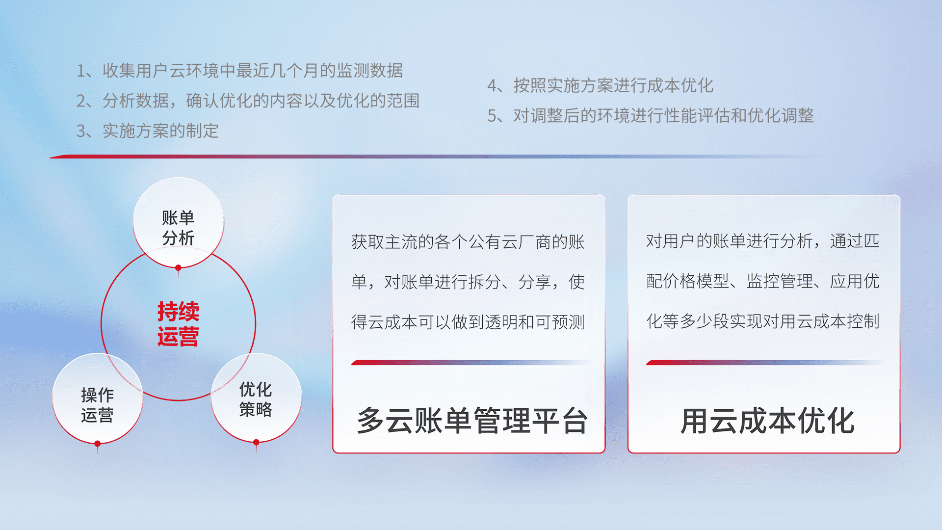 通过多云纳管,,以统一的资源数据模型把客户的云资源进行抽象和封装,,,,进而实现对多云资源的统一操作,,,,保障云资源管理的可靠性、、稳定性与可用性。。量身定制化运维内容,,,配置、、开发运维、、、补丁管理、、备份、、、、监控、、、、认证和访问管理、、审计和日常巡检等,,保障在用云过程中的可靠度,,,,稳定度以及高可用率。。。